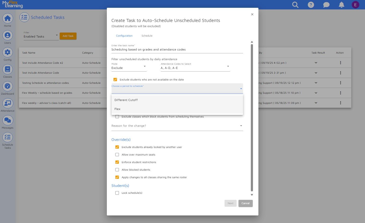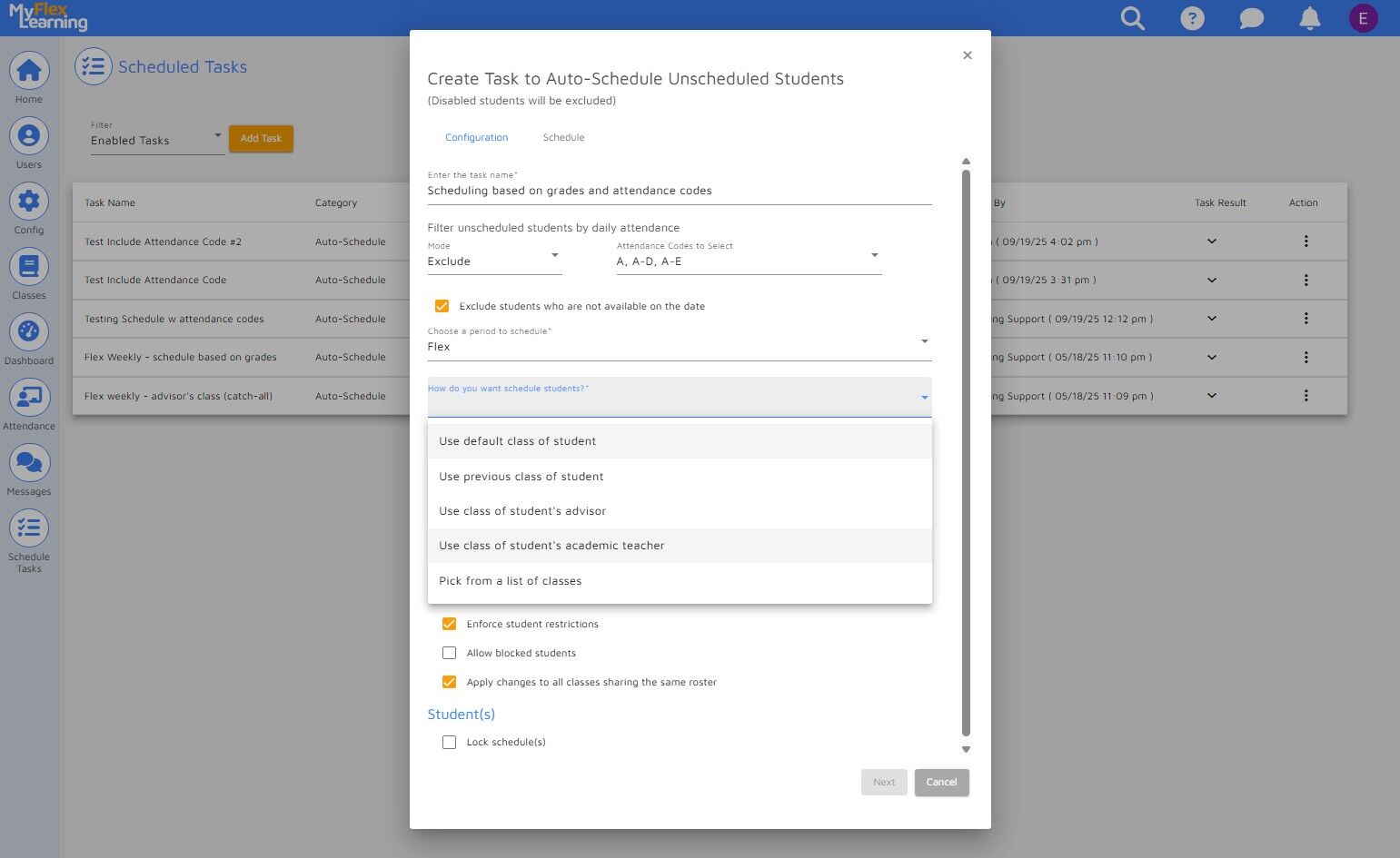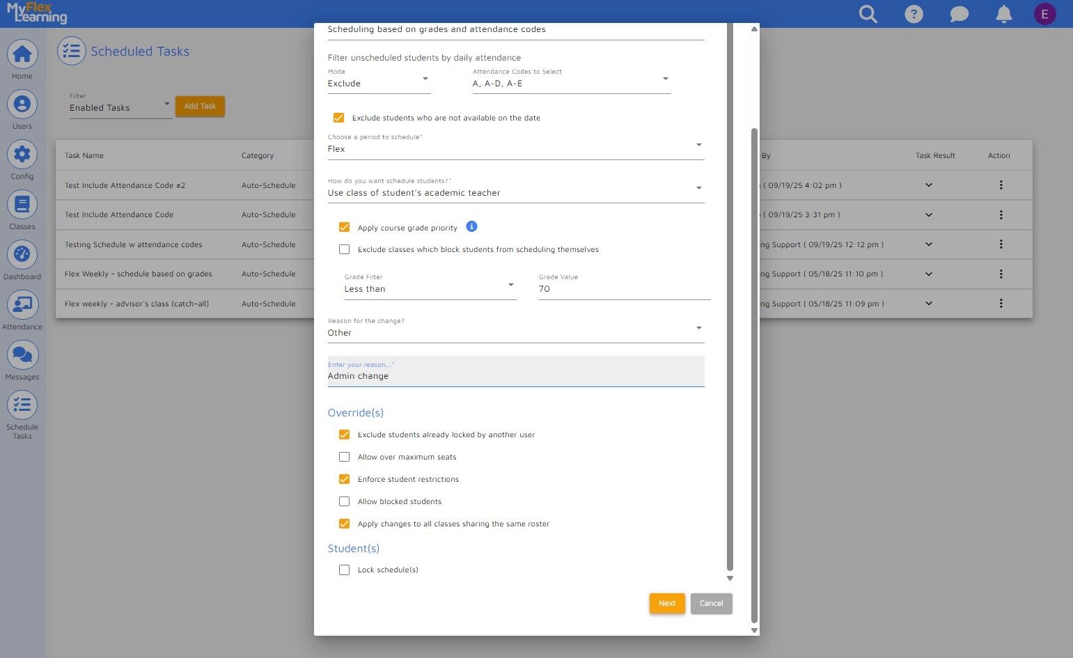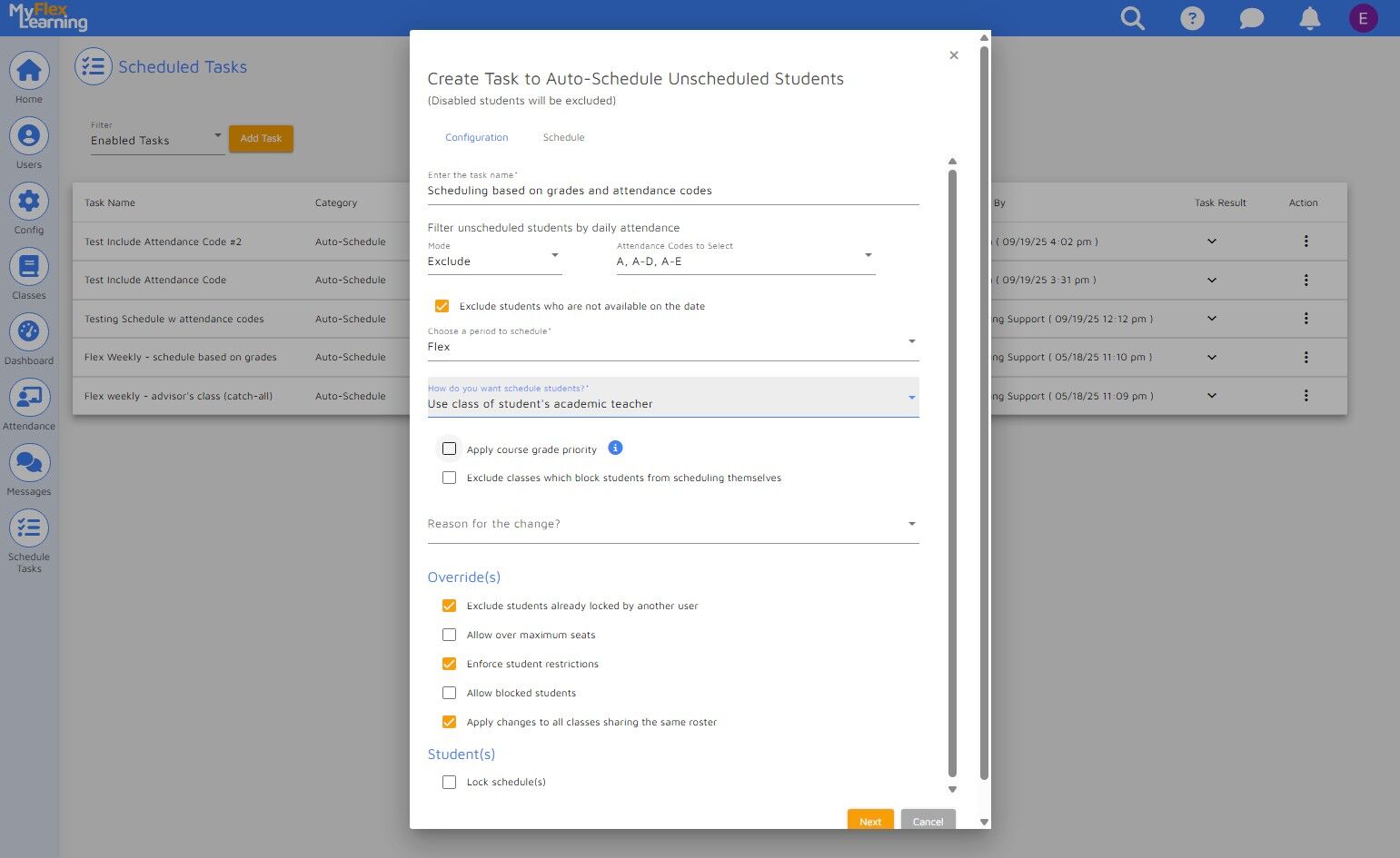 Administrators can streamline the scheduling of unscheduled students, ensuring that students are scheduled into a class before the flex period begins. This guide provides a step-by-step process for creating and viewing a scheduled task. The example below illustrates how to automatically schedule students based on their grades while also excluding students from the process with certain daily attendance codes. NOTE: These are optional tools in this process.