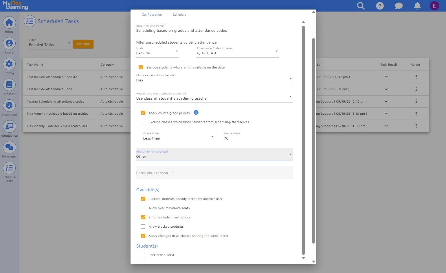 NOTE: Some schools choose to enter a reason for Scheduled Tasks to know the change was made via this method vs. manually changing the student's schedule.