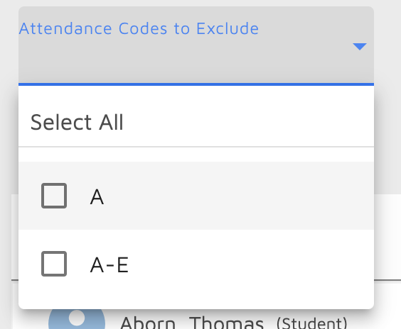 Select All option at the top of "Attendance Codes to Exclude"/"Attendance Codes to Include" drop down lists
